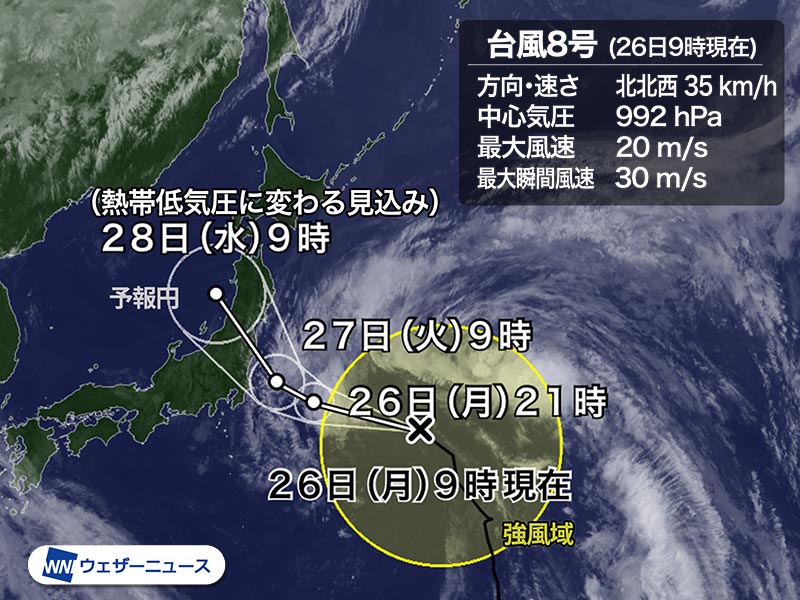 9fspphjjl0tmym from static.tenki.jp Oct 09, 2020 · 台風情報. May 31, 2021 · 令和3年 台風第3号に関する情報 2021年5月31日午前10時30分 気象庁 発表 台風第3号が発生しました。 【本文】 31日9時、ミンダナオ島の東の北緯8度20分、東経131度20分において、熱帯低気圧が台風第3号になりました。台風は1時間におよそ15キロの速さで北北西へ進んでいます。 Apr 15, 2021 · 【2019年最新情報】台風14号米軍進路予想!沖縄への影響は #2. Jun 24, 2021 · 令和3年 台風第5号に関する情報 第3号 (位置) 2021年6月24日午後6時45分 気象庁 発表 台風第5号は、フィリピンの東を1時間におよそ10キロの速さで西北西へ進んでいます。